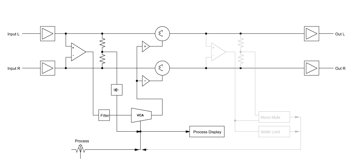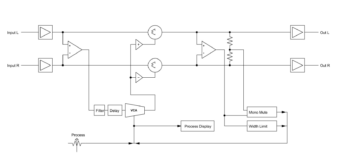 Die beiden Eingangssignale LINKS und RECHTS werden durch einen Summierer geleitet. Am Ende befinden sich die Ausgangsstufen. Somit